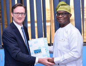 British High Commissioner to Nigeria, Richard Montgomery (l) when he paid a courtesy visit to the Managing Director of the News Agency of Nigeria (NAN), Buki Ponle (r) in Abuja.