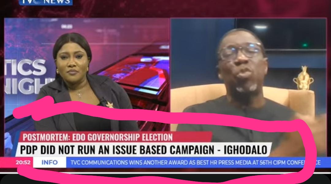“However, to the amasement of millions of viewers, TVC displayed a scroll bar stating, “PDP did not run issue-based campaign – Ighodalo,” which directly contradicts Dr. Ighodalo’s statements.