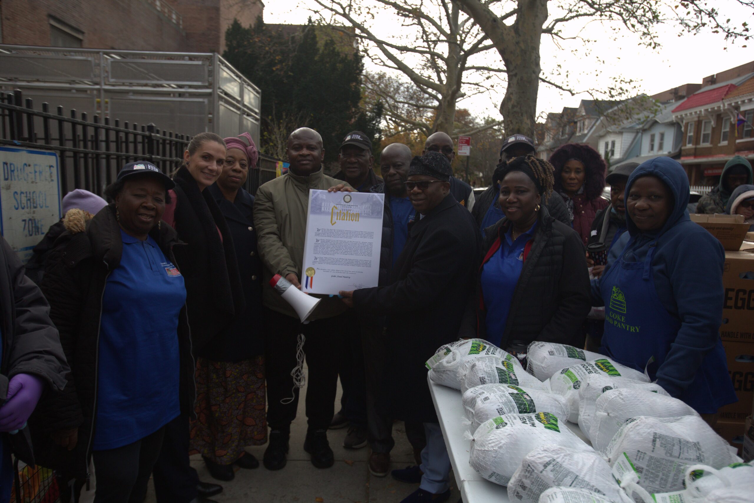 (Middle) Amb. Lot Egopija, Consul General of Nigeria in New York, and Pastor Timothy Famojuro, Pastor in charge of Christ Apostolic Church (first in the Americas) with staff of Goke Food Pantry holding a proclamation received by New York Mayor, Eric Adams during the distribution of turkey meat to celebrate 2023 Thanksgiving.