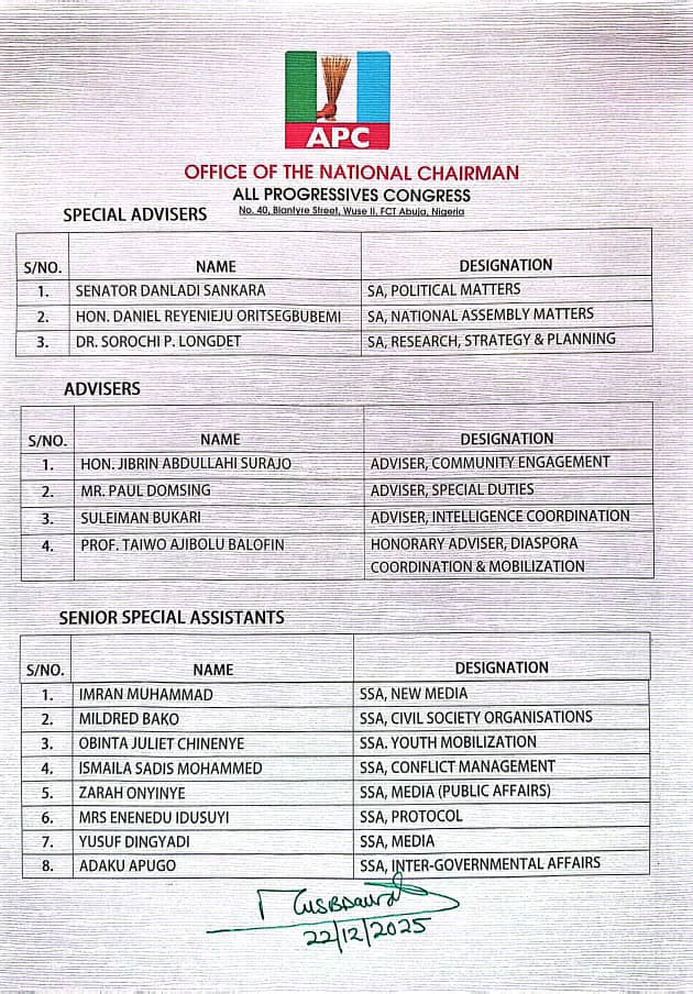 The National Chairman of the All Progressives Congress (APC), Professor Nentawe Goshwe Yilwatda, has approved the appointment of Special Advisers, Advisers, and Senior Special Assistants to strengthen the administrative and strategic capacity of the Party.