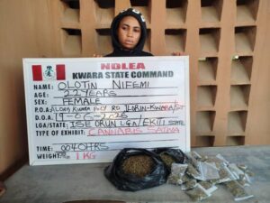 A 22-year-old female Student of Kwara State Polytechnic, Olotin Nifemi, notorious for selling illicit substances to other students, was on Thursday 19th June arrested at her base along Kwara Poly road, Ilorin, with 1kg skunk.