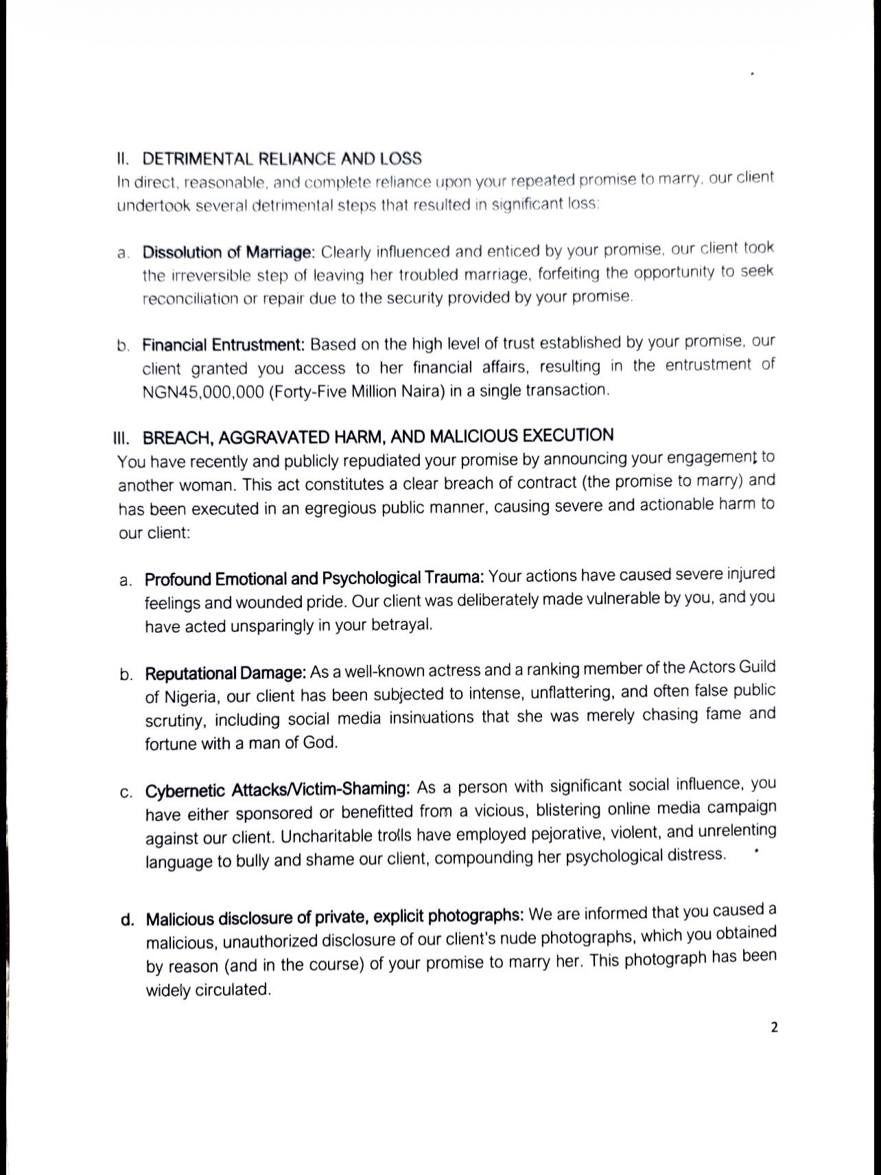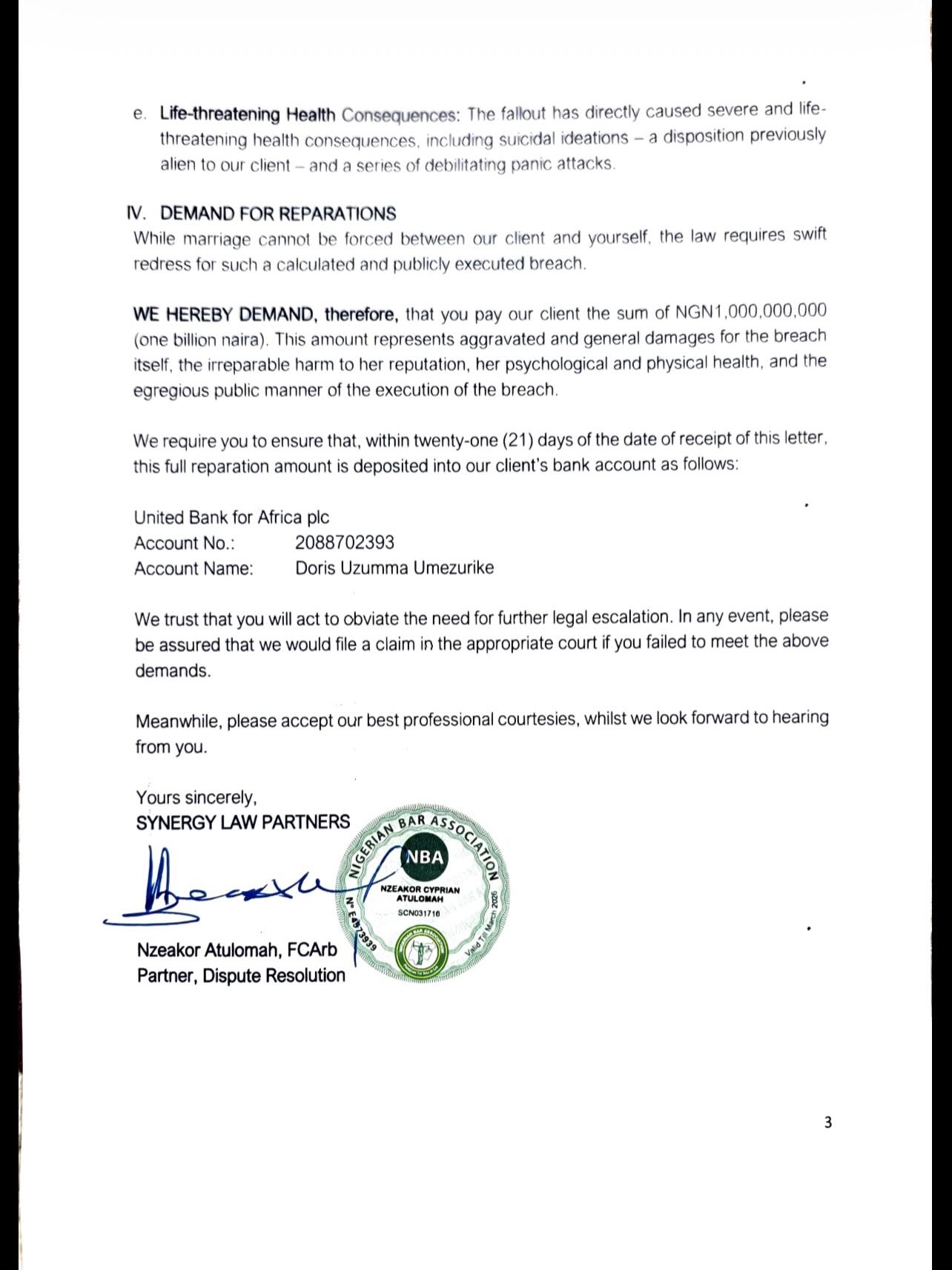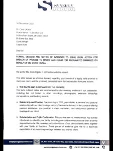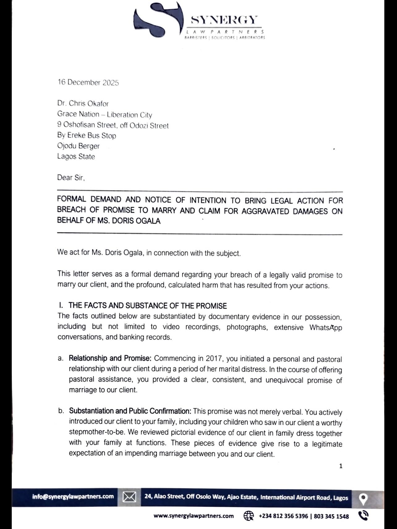 In a Demand letter dated December 16, 2025,  through her lawyer, Nzeakor Atulomah, of Synergy Law Partners, Ms Ogala gave Pastor Okafor 21 days within which to make the payment into a prescribed account or face further legal consequences. Below is the copy of the 3-page letter: