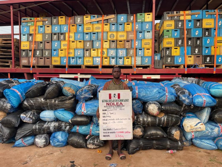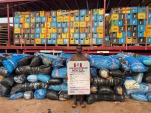 In Edo state, NDLEA operatives working on actionable intelligence on Saturday 11th April intercepted two long trucks marked LUY 172 XC and LUY 281 XC with bags of processed skunk concealed among cartons of beer along Warrake road, Auchi. One of the trucks was found to contain 3,900 kilograms of skunk, while the second had 3,345 kilograms, bringing the total weight to 7,245 kilograms. Five suspects arrested in connection with the seizure include: Ibrahim Abu, 29; Abu Abdullazeez, 28; Jibril Jaminu, 35; Andrew Moses, 22  and Ganiyu Abu, 21. The consignments were loaded at Sabongida-Ora in Owan West LGA and heading to Abuja when they were intercepted.