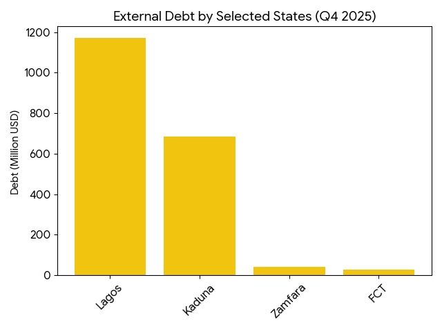 The NBS said that Lagos state also recorded the highest external debt in Q4 2025 with 1.17 billion dollars, followed by Kaduna state with 684.29 million dollars.