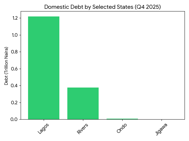 In a breakdown by states, the bureau said that Lagos state recorded the highest domestic debt of N1.22 trillion in Q4 2025, followed by Rivers with N378.81 billion.