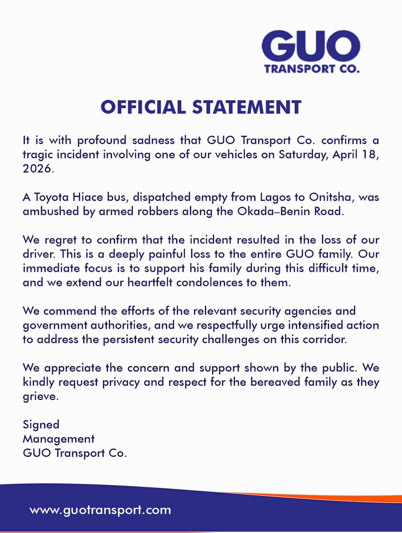 Political Economist NG recalls that a GUO Hiace bus was attacked on April 18, 2026. The bus, according to GUO Transport, was dispatched empty from Lagos to Onitsha and was ambushed by armed robbers along the Okada-Benin road.