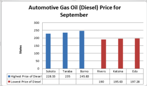 Meanwhile, the NBS said the price of Automotive Gas Oil (Diesel) increased from N207.98 recorded in August to N211.64 in September.