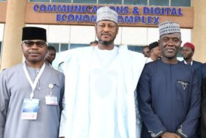 L-R: Director, Critical National Assets and Infrastructure Protection, Office of the National Security Advisers (ONSA), Enebong Effiom; Executive Governor, Katsina State, Dikko Radda and Executive Vice Chairman/Chief Executive Officer, Nigerian Communications Commission (NCC), Dr. Aminu Maida (NAN Photo)
